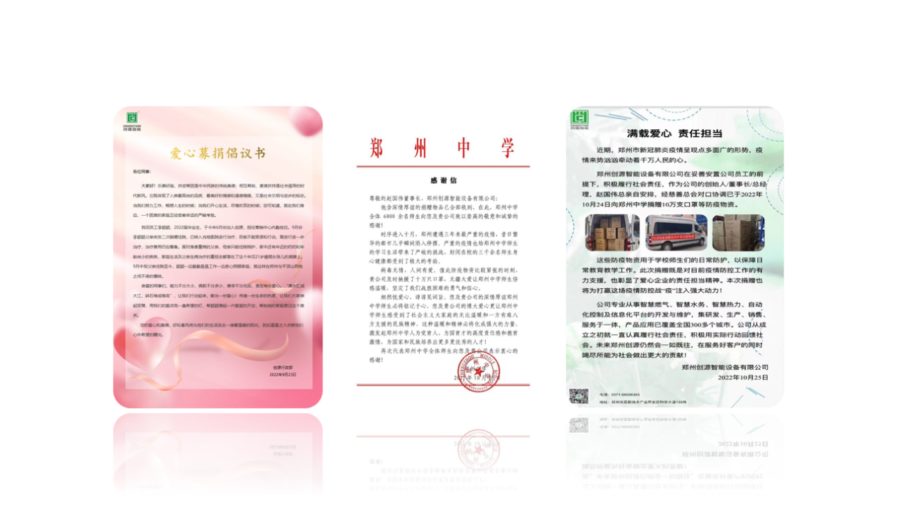 2010年公司成立之初,即向革命老區(qū)---河北省西柏坡華潤集團(tuán)承建的紅色希望小鎮(zhèn)捐贈無線遠(yuǎn)傳智能燃?xì)獗砑笆殖殖碓O(shè)備、運營軟件、電腦等價值40余萬元的軟/硬件裝備。并舉辦愛心募捐活動、在抗疫斗爭中積極捐贈物資。